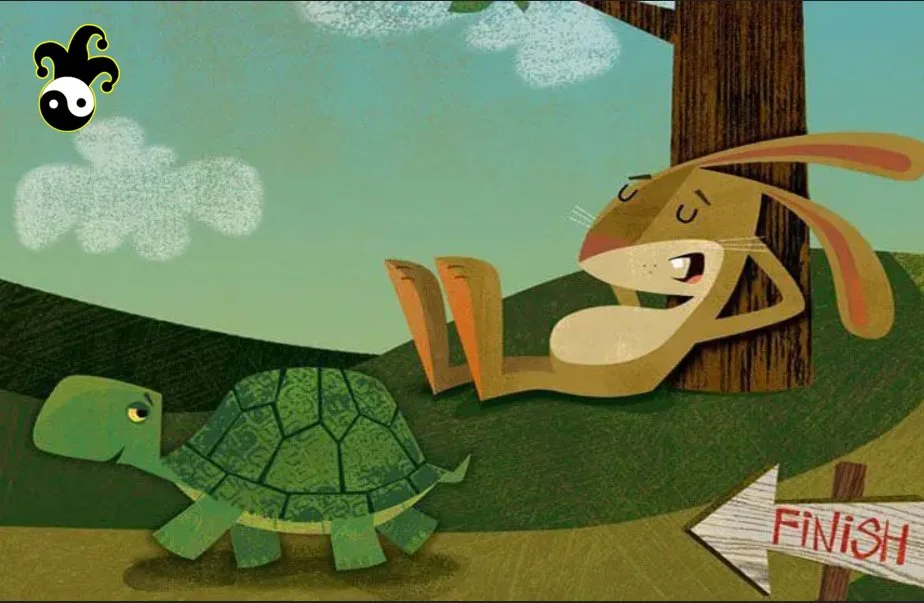 Het sprookje van de schildpad en de haas is een mooi voorbeeld van haastige spoed die zelden tot iets leidt; immers, hoe bewuster elke stap wordt gezet, hoe waardevoller het proces wordt. Illustratie gevonden op vivekbhageria.com