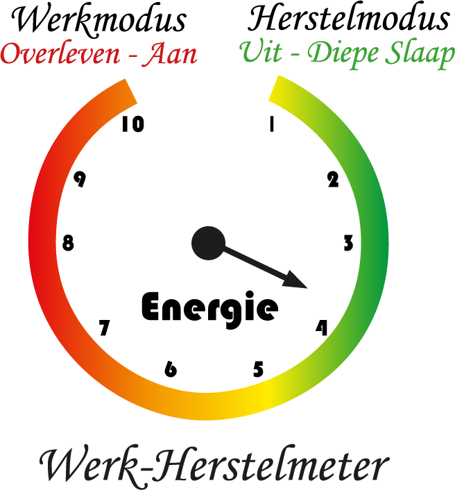 Stel je een snelheidsmeter voor die van 1 naar 10 gaat, maar in plaats van snelheid meten we hoe ver we in de werk - of herstelmodus zijn: een werk- & herstelmeter. Op 1 zijn we in diepe slaap, de ultieme herstelmodus. Op 10 zijn we ervan overtuigd dat we ons in een levensbedreigende situatie bevinden en dus hyper alert, de ultieme werkmodus. Bovendien wordt op 1 veel brandstof geproduceerd terwijl er nauwelijks wordt verbruikt, maar op 10 hebben we grote hoeveelheden brandstof nodig terwijl er niets wordt geproduceerd. Voorts wordt van grofweg 1 tot 4 meer brandstof geproduceerd dan verbruikt en vanaf 5 wordt meer brandstof verbruikt dan nieuwe wordt geproduceerd. Tijdens een stressreactie ten slotte ligt de werk- & herstelmeter gemiddeld tussen de 8 en 10.